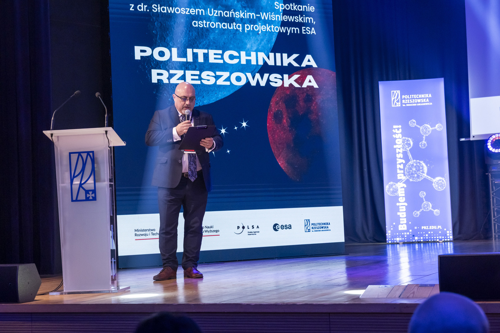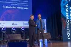 „Dla naszych studentów dr inż. Sławosz Uznański-Wiśniewski jest symbolem odwagi w przekraczaniu granic – tych naukowych, technologicznych i ludzkich, a swoją pasją i determinacją udowadnia, że polska myśl techniczna może sięgać gwiazd. Pańska droga do Europejskiej Agencji Kosmicznej pokazuje, że konsekwencja, wiedza i marzenia potrafią otworzyć drogę do gwiazd” – mówił rektor. Profesor wyraził przekonanie, że dzisiejsze spotkanie rozpali w naszych studentach ciekawość i ambicję do kontynuowania badania nad tym, co jeszcze nieznane – od mikrosatelitów, przez robotykę kosmiczną, aż po technologie przyszłych misji załogowych. „Niech Pana wizyta będzie dla całej społeczności Politechniki Rzeszowskiej przypomnieniem, że kosmos nie jest barierą – jest punktem wyjścia do eksploracji, odkryć i postępu, a także symbolem otwierania się na nowe perspektywy” – dodał rektor.
