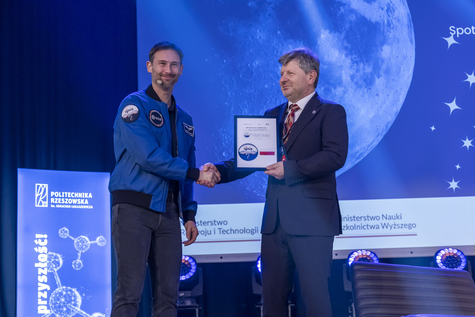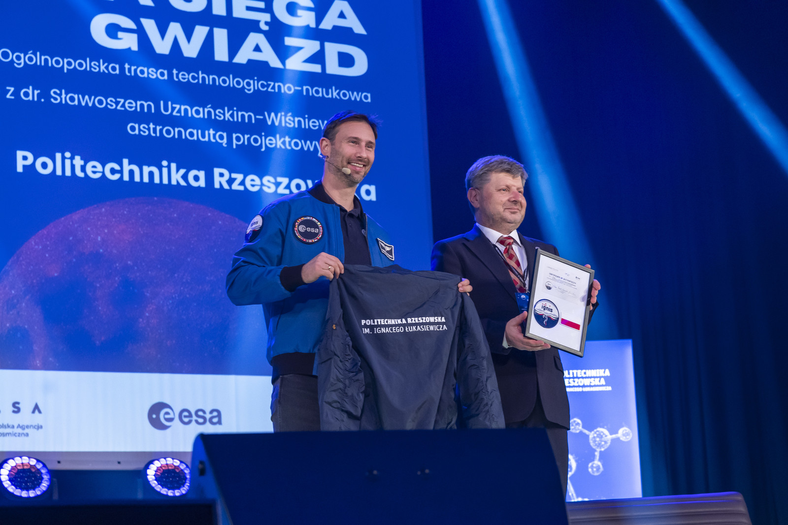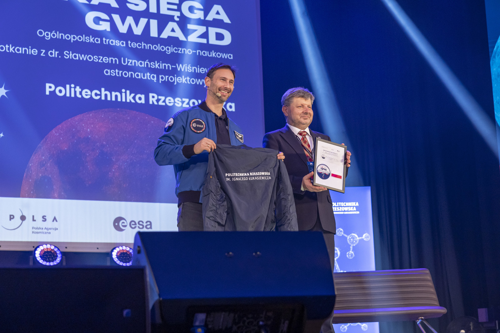 Na koniec swojego wystąpienia dr inż. Sławosz Uznański-Wiśniewski wręczył rektorowi Politechniki Rzeszowskiej specjalny certyfikat z logo IGNIS i polską flagą, która była w kosmosie. Z kolei polski astronauta otrzymał od rektora kurtkę z logo Politechniki Rzeszowskiej.