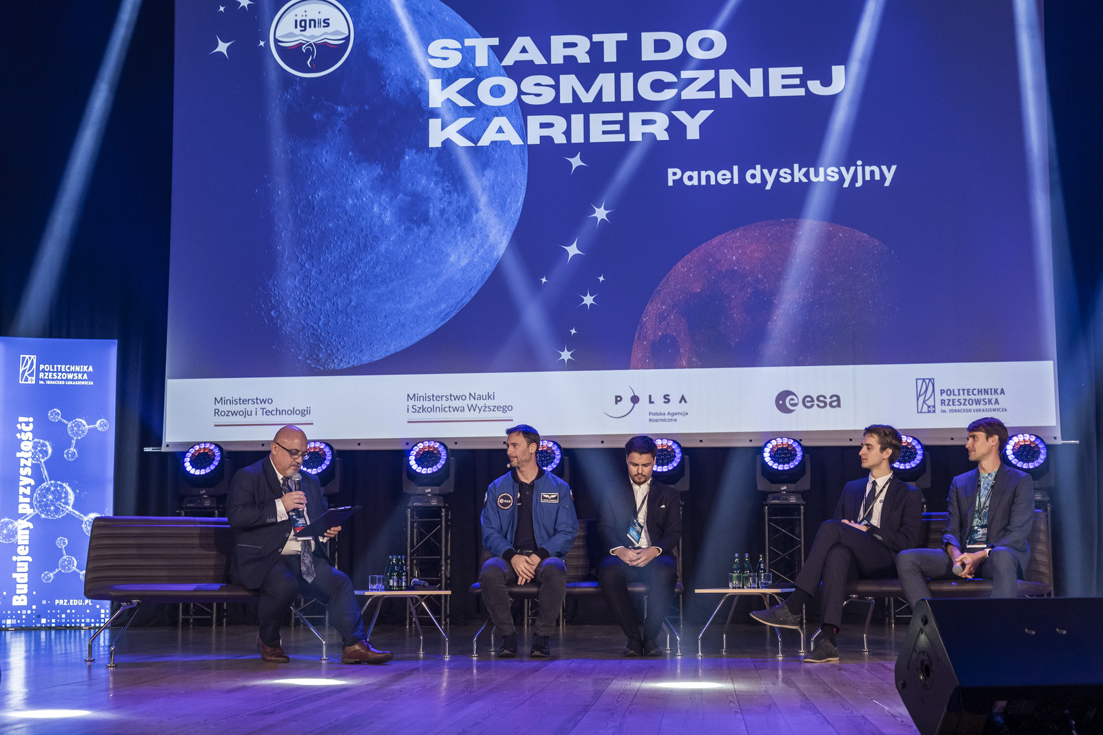 O kulisach powstawania eksperymentów, wyzwaniach związanych z ich realizacją oraz emocjami towarzyszącymi w trakcie wynoszenia ich na orbitę mówili również naukowcy – autorzy eksperymentów podczas panelu dyskusyjnego. W panelu dyskusyjnym ,,Start do kosmicznej kariery”, którego moderatorem był dr hab. inż. Andrzej Majka, prof. PRz, oprócz prelegentów udział wzięli dr inż. Sławosz Uznański-Wiśniewski oraz inż. Michał Radawiec, student Politechniki Rzeszowskiej, prezes SKN Lotników i wiceprezes SKN Inżynierii Kosmicznej, uczestnik i laureat międzynarodowych zawodów łazików marsjańskich (m.in. Anatolian, Australian, University Rover Challenge). Uczestnicy panelu rozmawiali o możliwościach rozwoju zawodowego w branży kosmicznej, współpracy nauki z przemysłem oraz roli uczelni technicznych w kształceniu przyszłych specjalistów sektora kosmicznego.