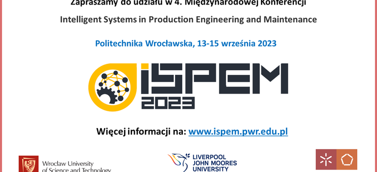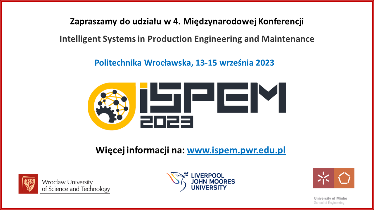 Zapraszamy do udziału w IV Międzynarodowej Konferencji Intelligent Systems in Production Engineering and Maintenance ISPEM 2023, która odbędzie się we Wrocławiu w dniach 13-15.09.2023. Konferencja organizowana jest przez Politechnikę Wrocławską, Liverpool John Moores University oraz University of Minho. Współorganizatorem konferencji jest Politechnika Rzeszowska.