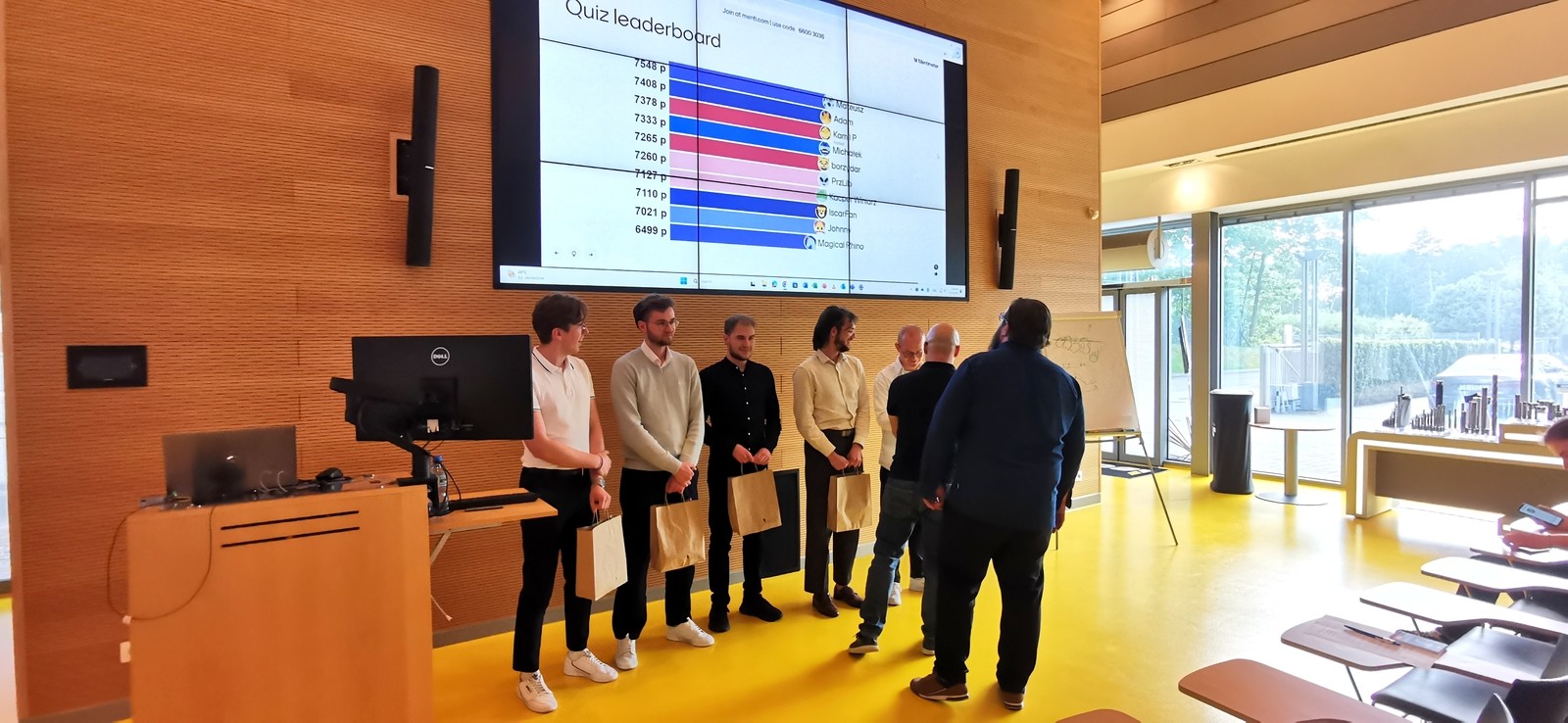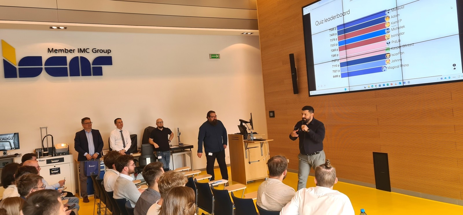 Na zakończenie warsztatów zorganizowano QUIZ wiedzy, który poprowadził dr inż. Marcin Sałata. Quiz prowadzony był z wykorzystaniem aplikacji interaktywnej, która oprócz punktów przyznawanych za prawidłowe odpowiedzi naliczała dodatkowe punkty za szybkość ich udzielania, czuwając nad przebiegiem rywalizacji w czasie rzeczywistym. Uczestnicy z najlepszym wynikiem otrzymali od firmy ISCAR Poland upominki w uznaniu za zaangażowanie i bardzo dobre wyniki, a o zwycięstwie decydowały ułamki sekund, co pokazuje, jak dużym zainteresowaniem cieszyła się tematyka nowoczesnych technologii obróbki i narzędzi skrawających. Wszystkim uczestnikom serdecznie gratulujemy zaangażowania i zdobytej wiedzy.