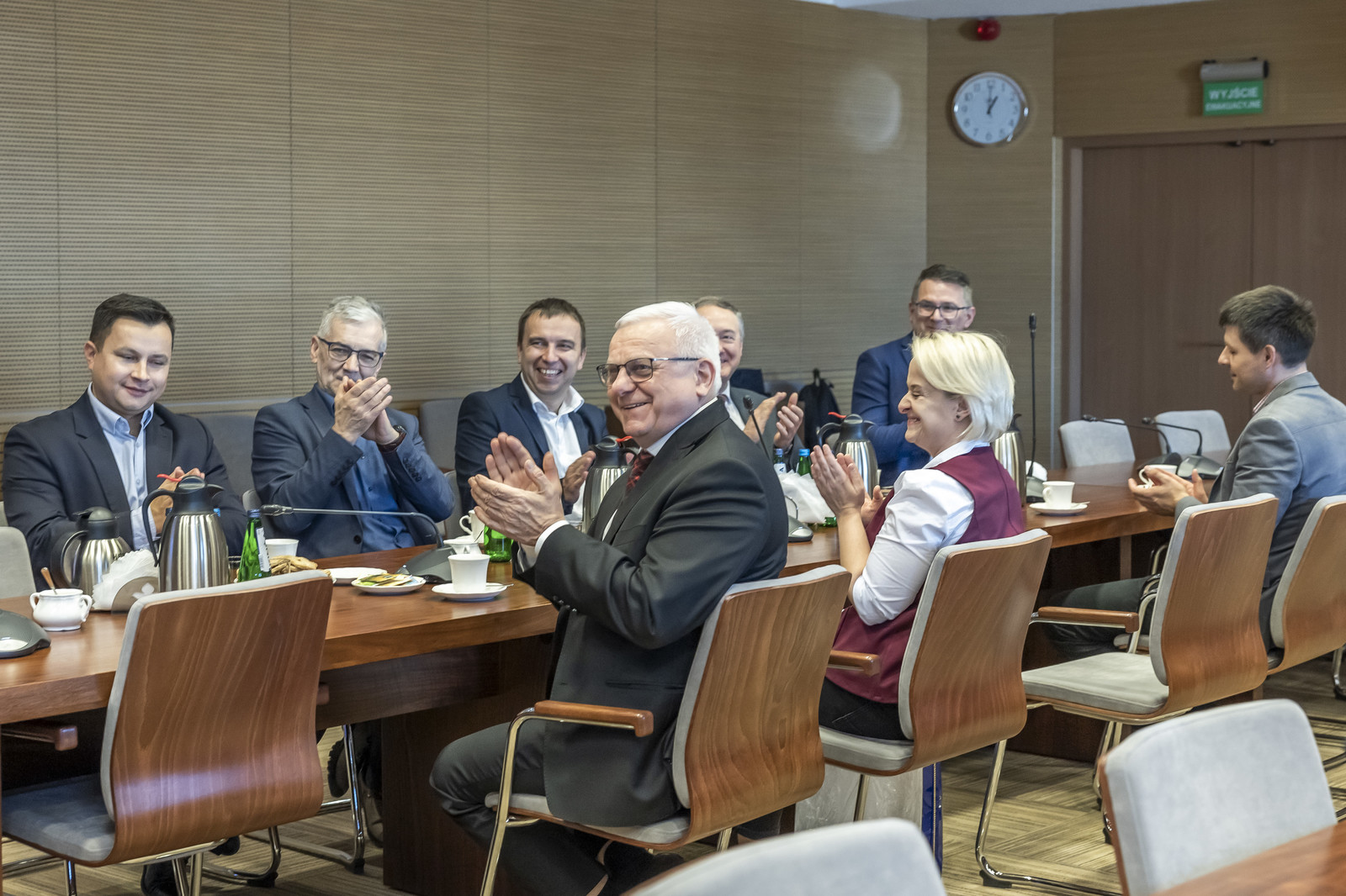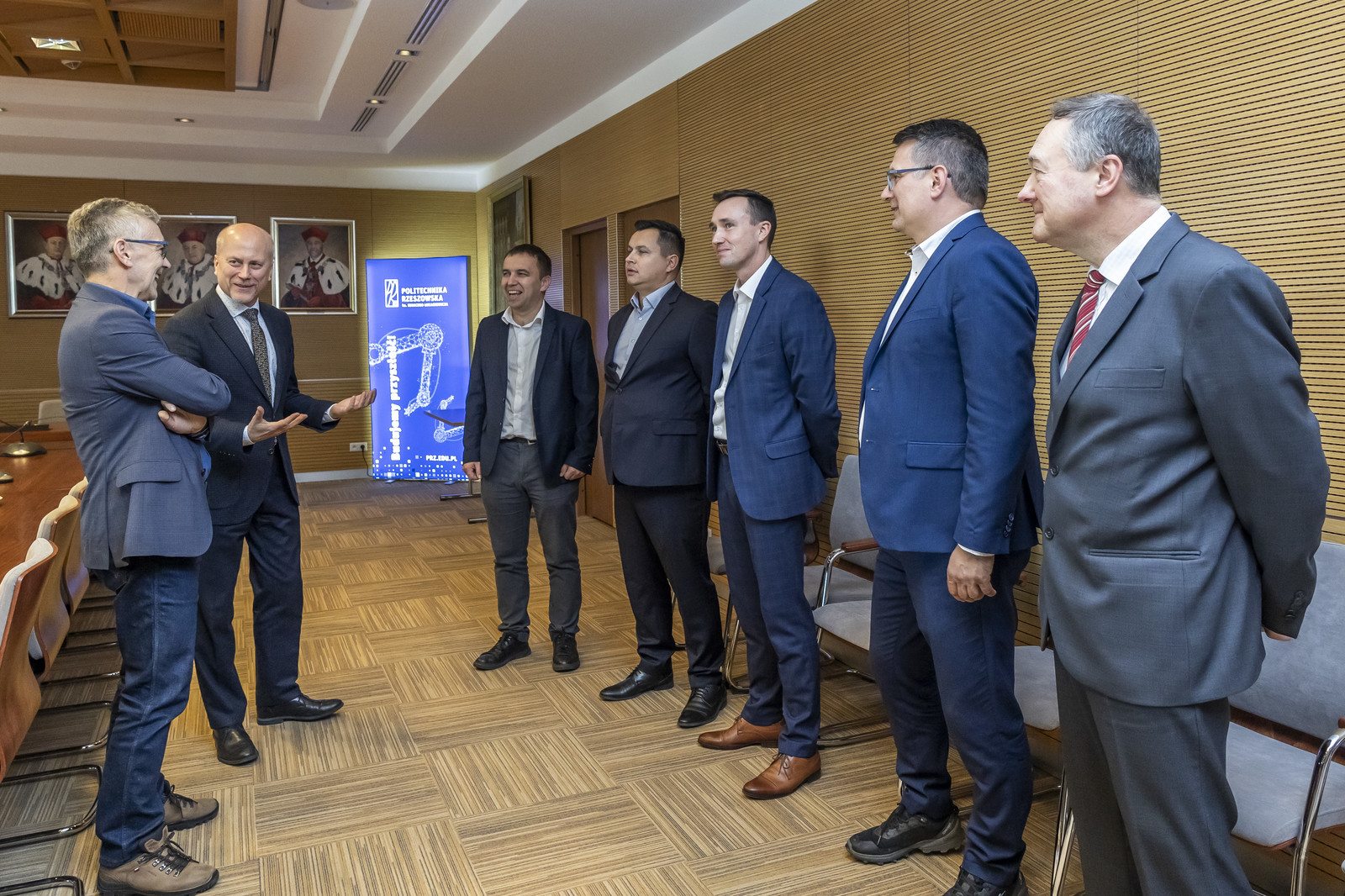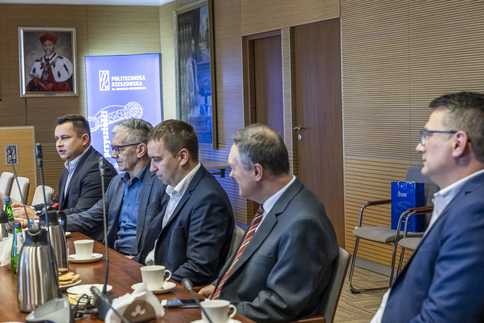 W spotkaniu uczestniczyli także: dziekan Wydziału Budowy Maszyn i Lotnictwa dr hab. inż. Adam Marciniec prof. PRz, kierownik Katedry Technik Wytwarzania i Automatyzacji prof. dr hab. inż. Andrzej Kawalec, dyrektor Centrum Transferu Technologii Politechniki Rzeszowskiej mgr Maciej Szalacha, koordynatorzy umowy ze strony Politechniki Rzeszowskiej dr hab. inż. Witold Habrat, prof. PRz i dr inż. Marcin Sałata. Collins Aerospace reprezentowali: dyrektorka personalna i członkini zarządu Kaja Zielonka, dyrektor zakładu w Tajęcinie Sylwester Kozioł, dyrektor Wydziału Obróbki Mechanicznej Jacek Gaj oraz szef Działu Technologicznego Przemysław Guzik.