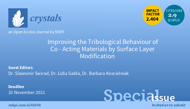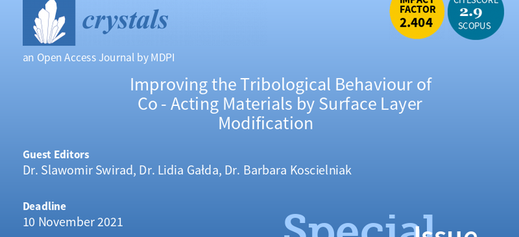 Specjalne wydanie czasopisma Crystals - "Improving the Tribological Behaviour of Co-Acting Materials by Surface Layer Modification" poświęcone jest przede wszystkim możliwości modyfikacji warstwy wierzchniej materiałów w celu poprawy właściwości tribologicznych elementów współpracujących tarciowo.