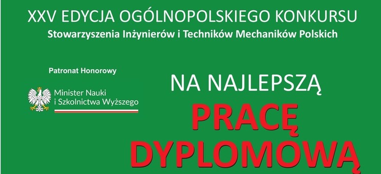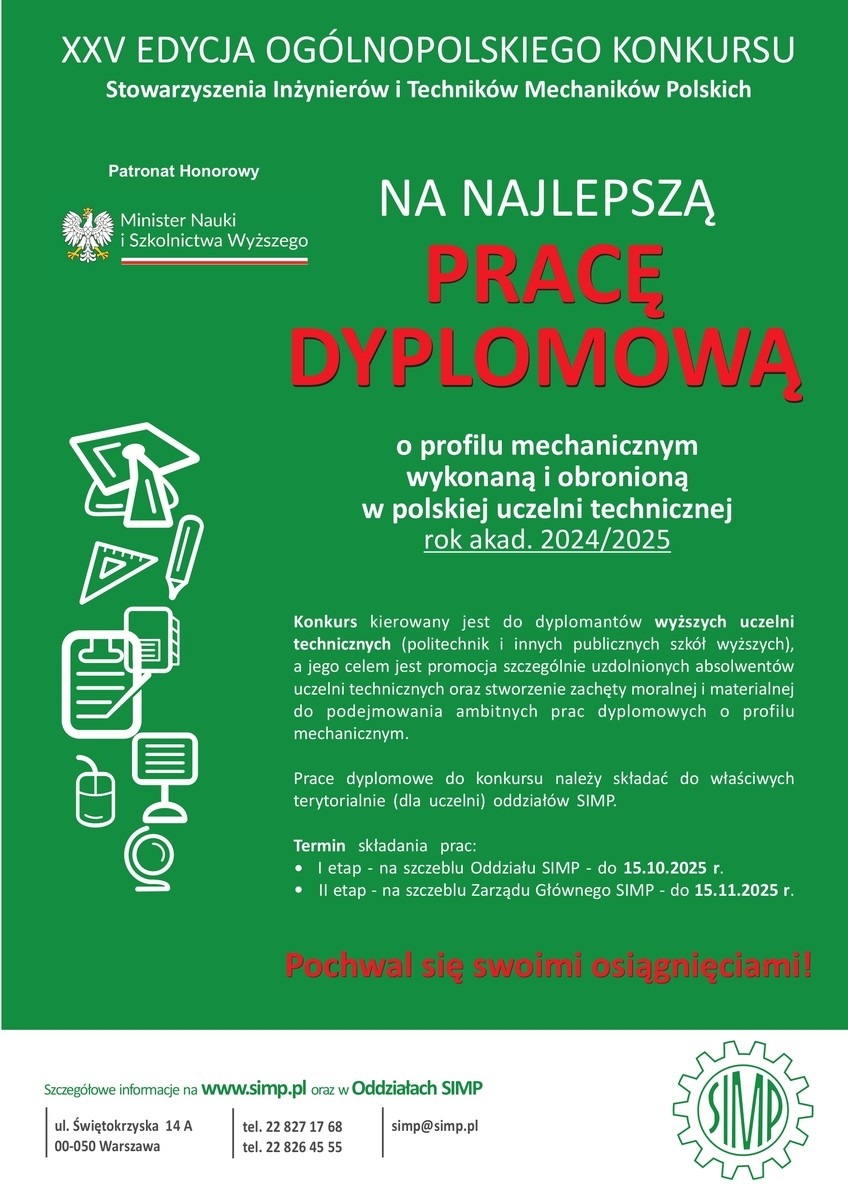 Stowarzyszenie Inżynierów i Techników Mechaników Polskich (SIMP) ogłosiło rozpoczęcie XXV edycji Ogólnopolskiego Konkursu o dyplom i nagrodę Prezesa SIMP na najlepszą pracę dyplomową o profilu mechanicznym, wykonaną i obronioną w roku akademickim 2024/2025.