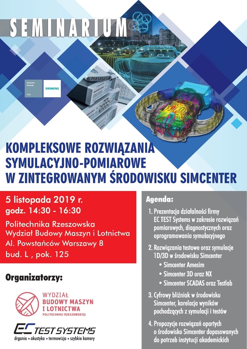 W dniu 5.11.2019 o godz. 14:30 - 16:30 na Wydziale Budowy Maszyn i Lotnictwa Politechniki Rzeszowskiej odbyło się seminarium naukowe dot. kompleksowych rozwiązań pomiarowych i symulacyjnych firmy Siemens w zastosowaniach naukowych i inżynierskich. Na zaproszenie Dziekana Wydziału Budowy Maszyn i Lotnictwa dr. hab. inż. Aleksandra Mazurkowa, prof. PRz we współpracy z EC Test Systems licznie odpowiedzieli pracownicy oraz studenci Politechniki Rzeszowskiej.
