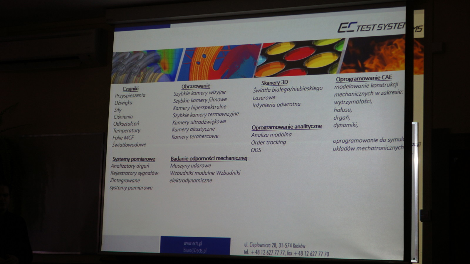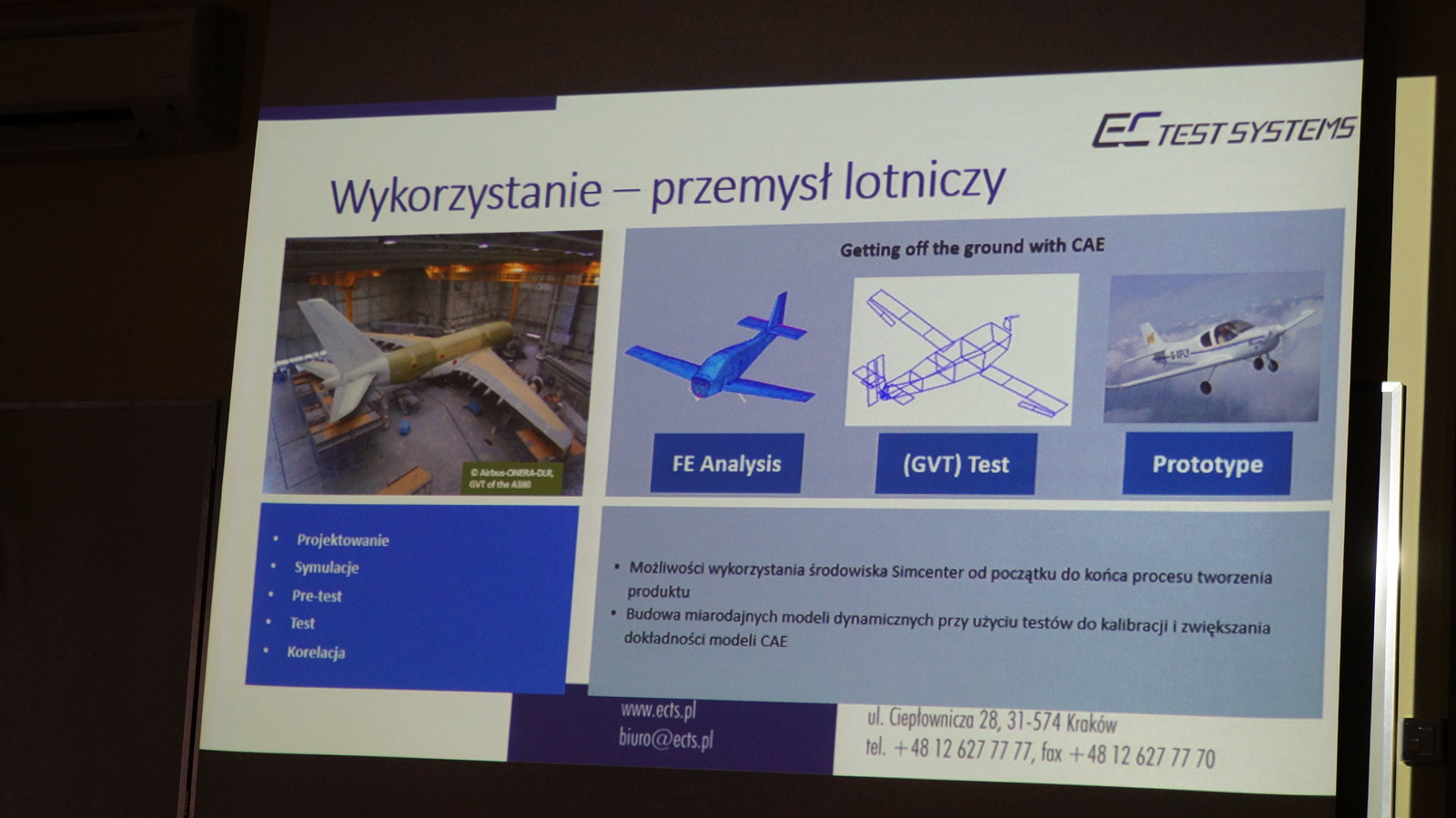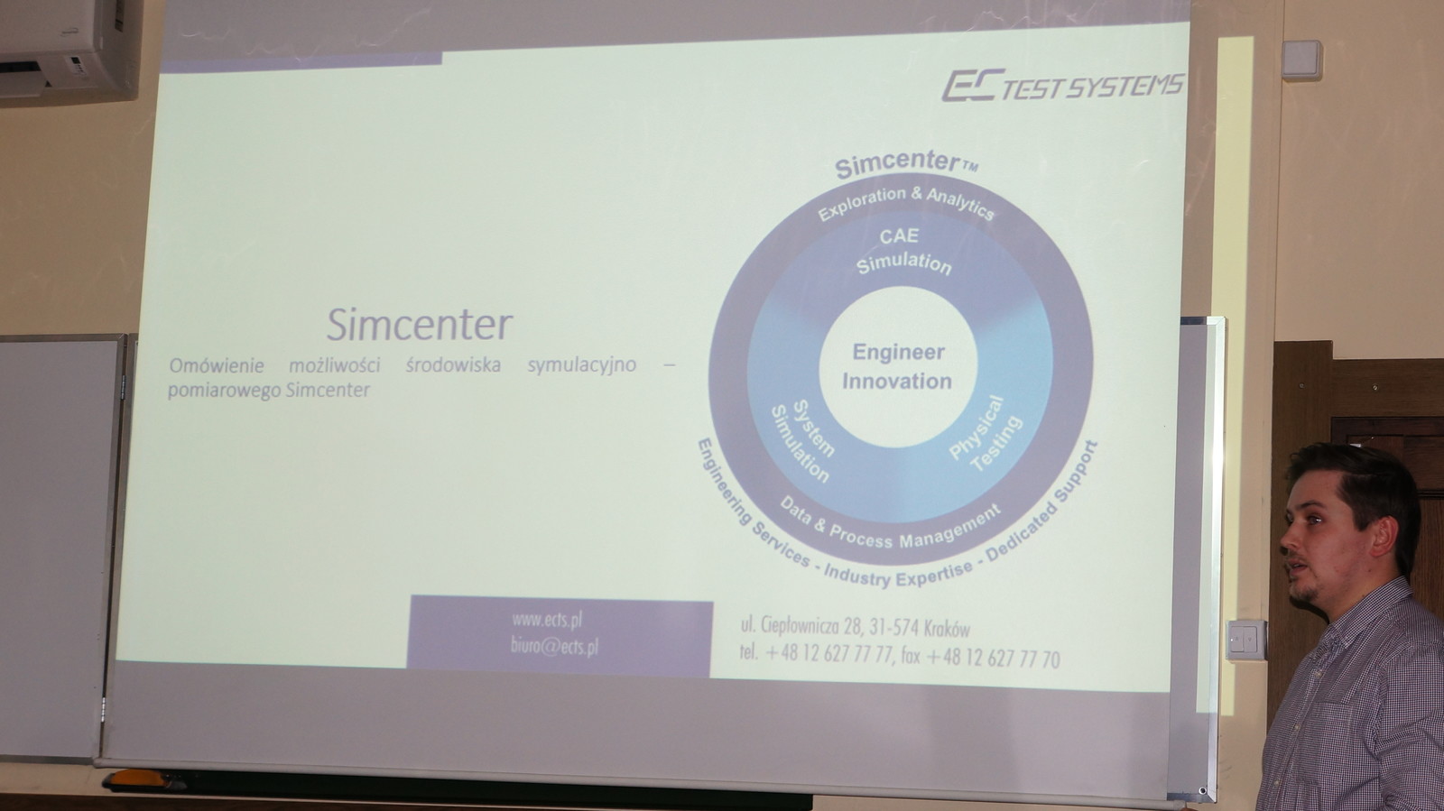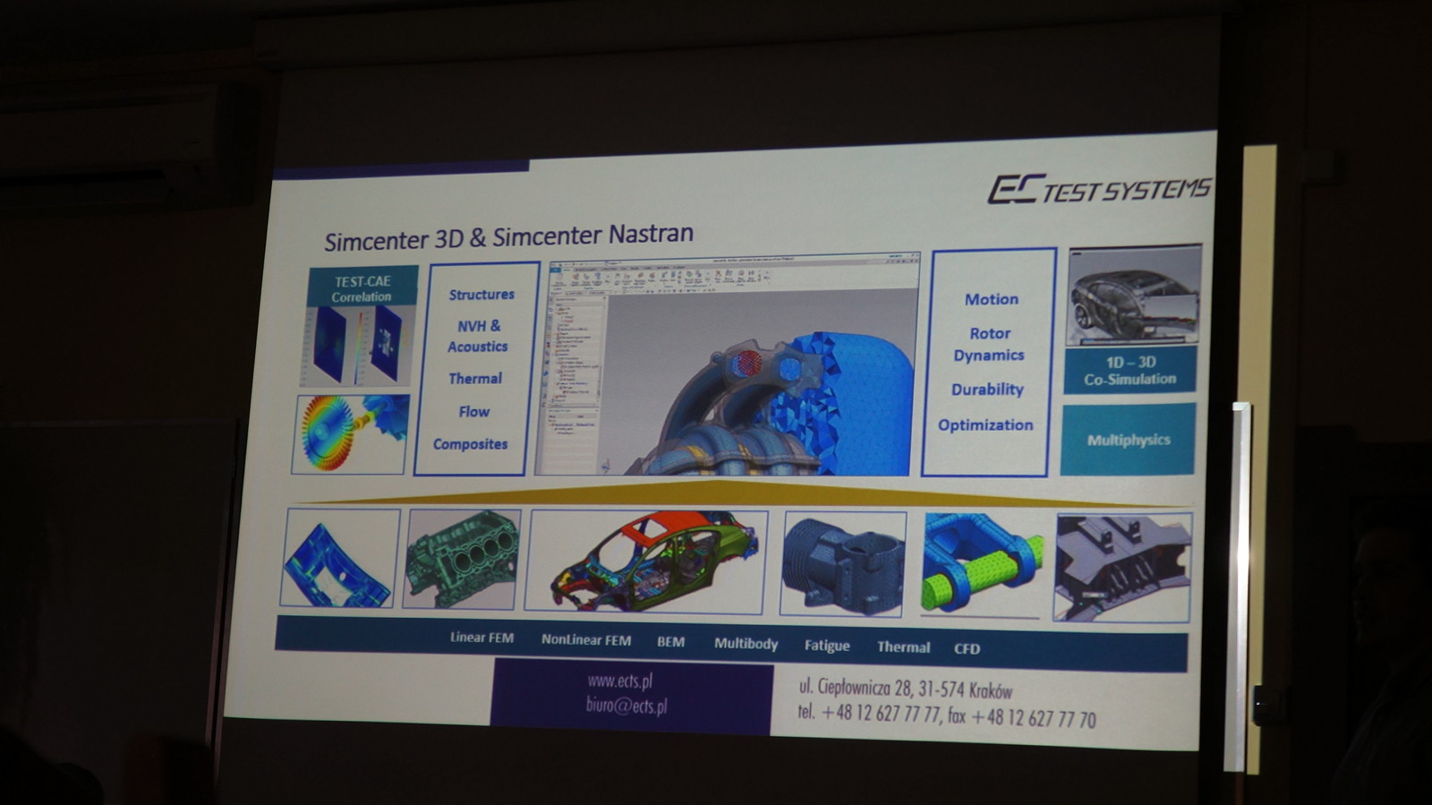 W trakcie spotkania zaprezentowano działalność firmy EC TEST Systems w zakresie rozwiązań pomiarowych, diagnostycznych oraz oprogramowania symulacyjnego. Omówiono rozwiązania testowe oraz symulacje 1D/3D w środowisku Simcenter: Simcenter Amesim, Simcenter 3D oraz NX, Simcenter SCADAS oraz Testlab. Przybliżono zalety rozwiązania "cyfrowy bliźniak" w środowisku Simcenter, korelację wyników pochodzących z symulacji i testów oraz przedstawiono propozycje rozwiązań opartych o środowisko Simcenter, dopasowanych do potrzeb instytucji akademickich.