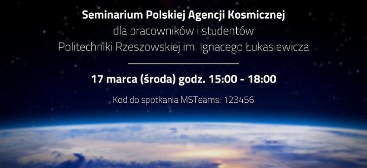 Polska Agencja Kosmiczna ma zaszczyt zaprosić studentów i pracowników Politechniki Rzeszowskiej na seminarium poświęcone tematyce kosmicznej. Seminarium odbędzie się w najbliższą środę, 17 marca b.r. w godzinach 15 - 18 w formie wideokonferencji na platformie MS Teams.