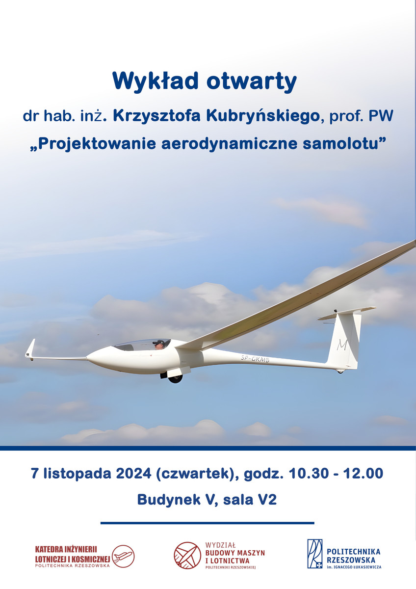 Dziekan Wydziału Budowy Maszyn, dr hab. inż. Adam Marciniec, Prof. PRz oraz Kierownik Katedry Inżynierii Lotniczej i Kosmicznej dr hab. Andrzej Majka, Prof. PRz serdecznie zapraszają pracowników i studentów na wykład otwarty dr hab. inż. Krzysztofa Kubryńskiego, prof. PW, pt. „Projektowanie aerodynamiczne samolotu"